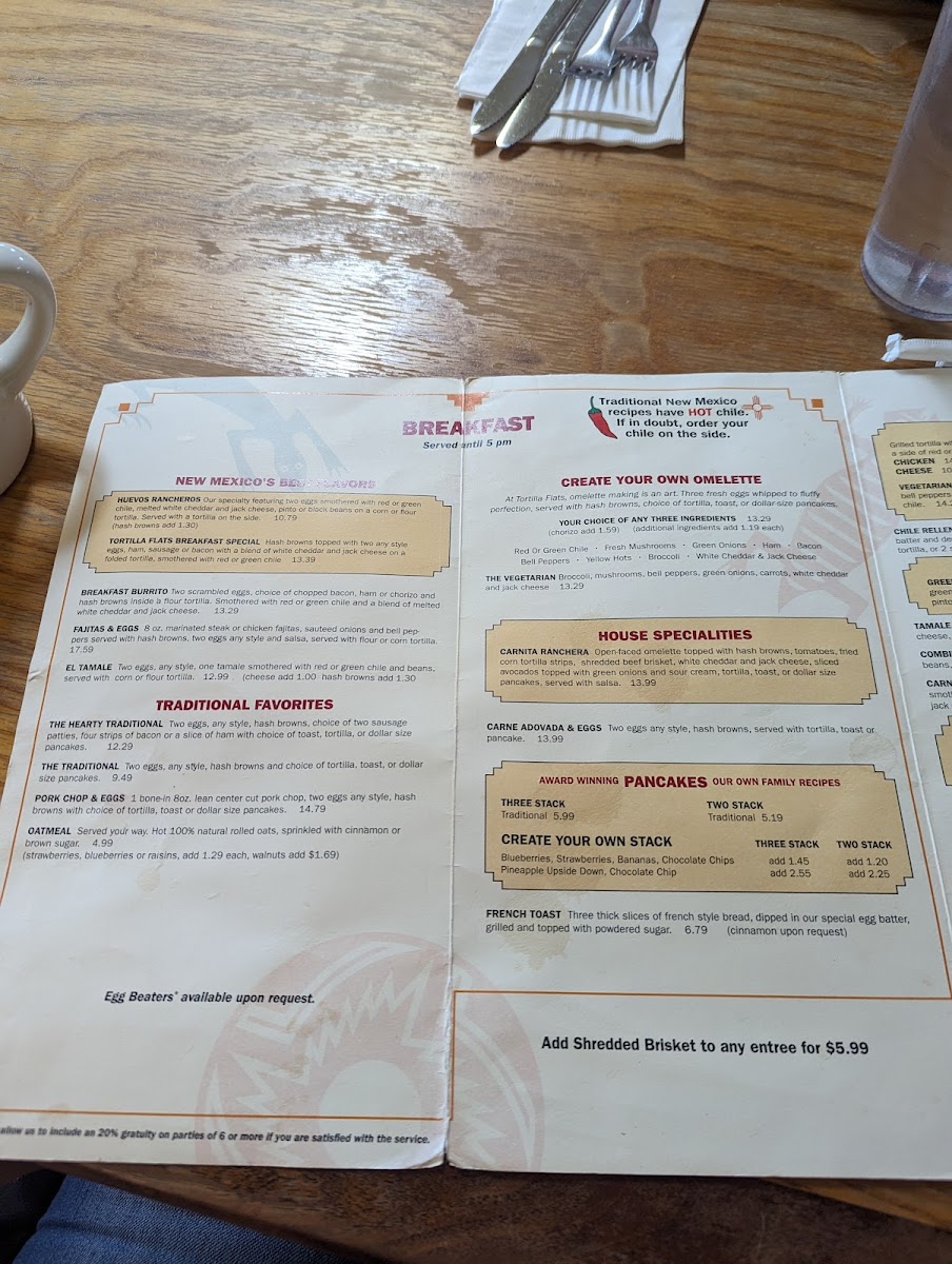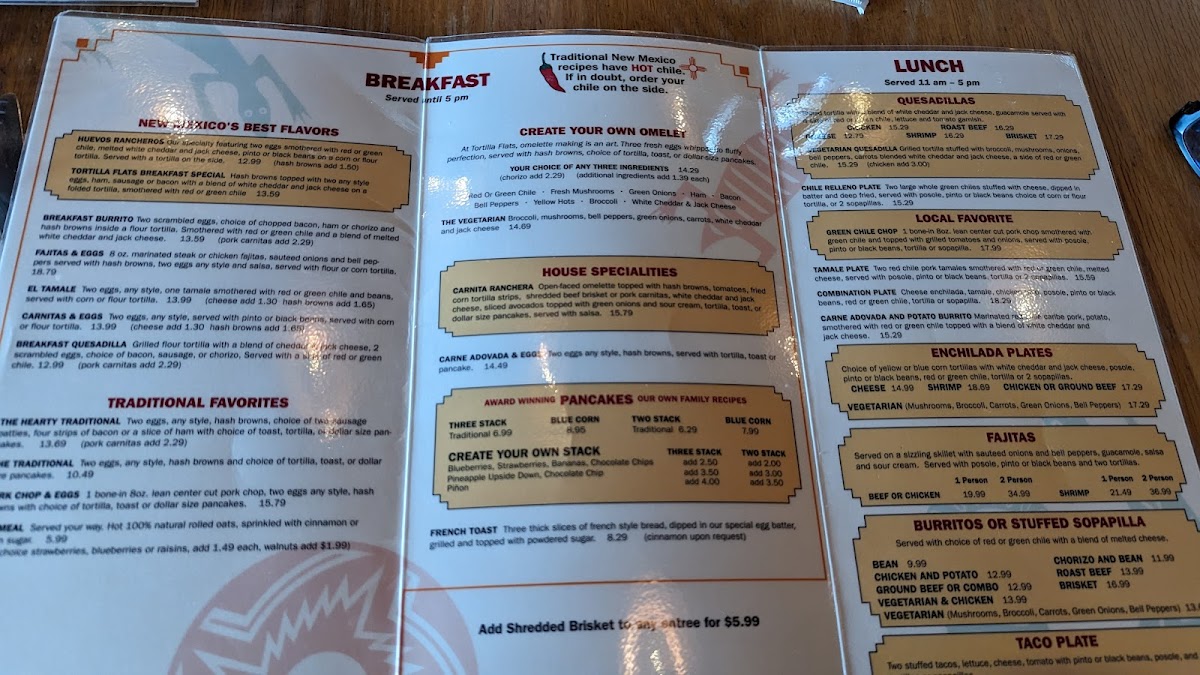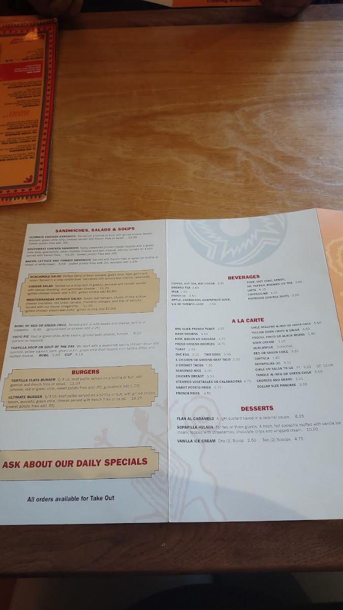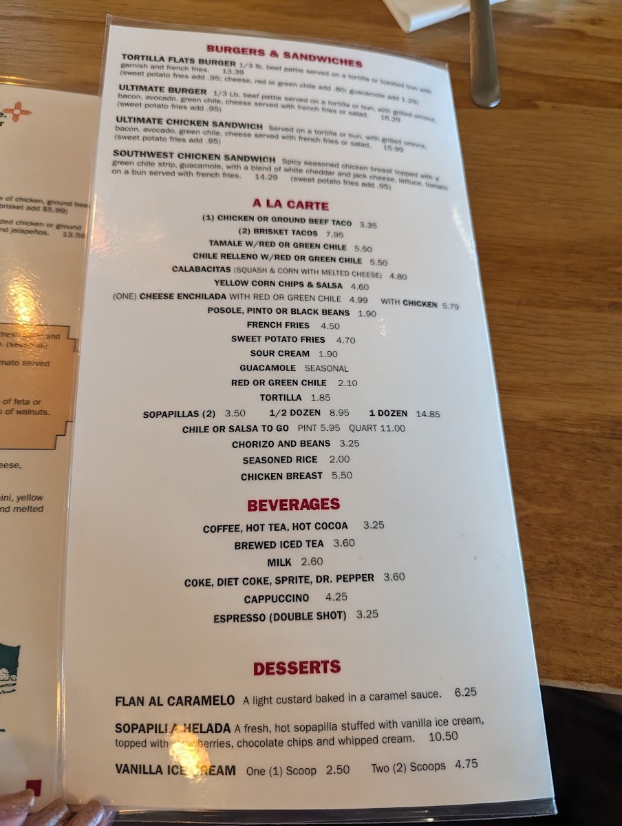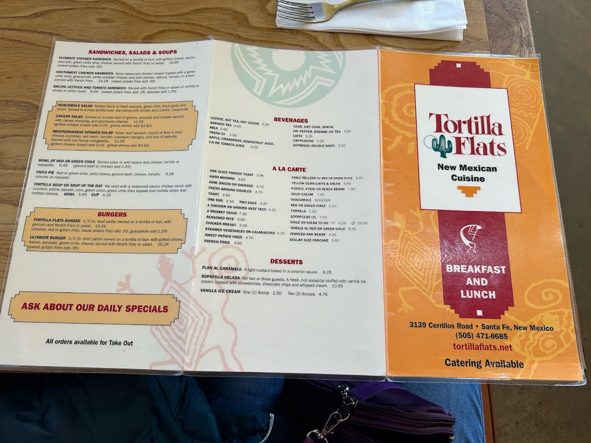 If you're craving bold flavors and a cozy atmosphere, look no further than Tortilla Flats Menu. Located at 3139 Cerrillos Rd, Santa Fe, NM, this spot serves up a vibrant mix of Southwestern favorites, from sizzling fajitas to rich, flavorful enchiladas. Whether you're in the mood for something spicy or a comforting plate of queso, the menu has something to satisfy every craving. The laid-back vibe of the restaurant pairs perfectly with its mouthwatering dishes, offering a true taste of Santa Fe’s best. With a variety of tacos, burritos, and house specialties, there's no shortage of options to explore. Perfect for a casual meal with friends or family, Tortilla Flats makes sure every bite is packed with that signature Southwestern kick you won’t forget.
