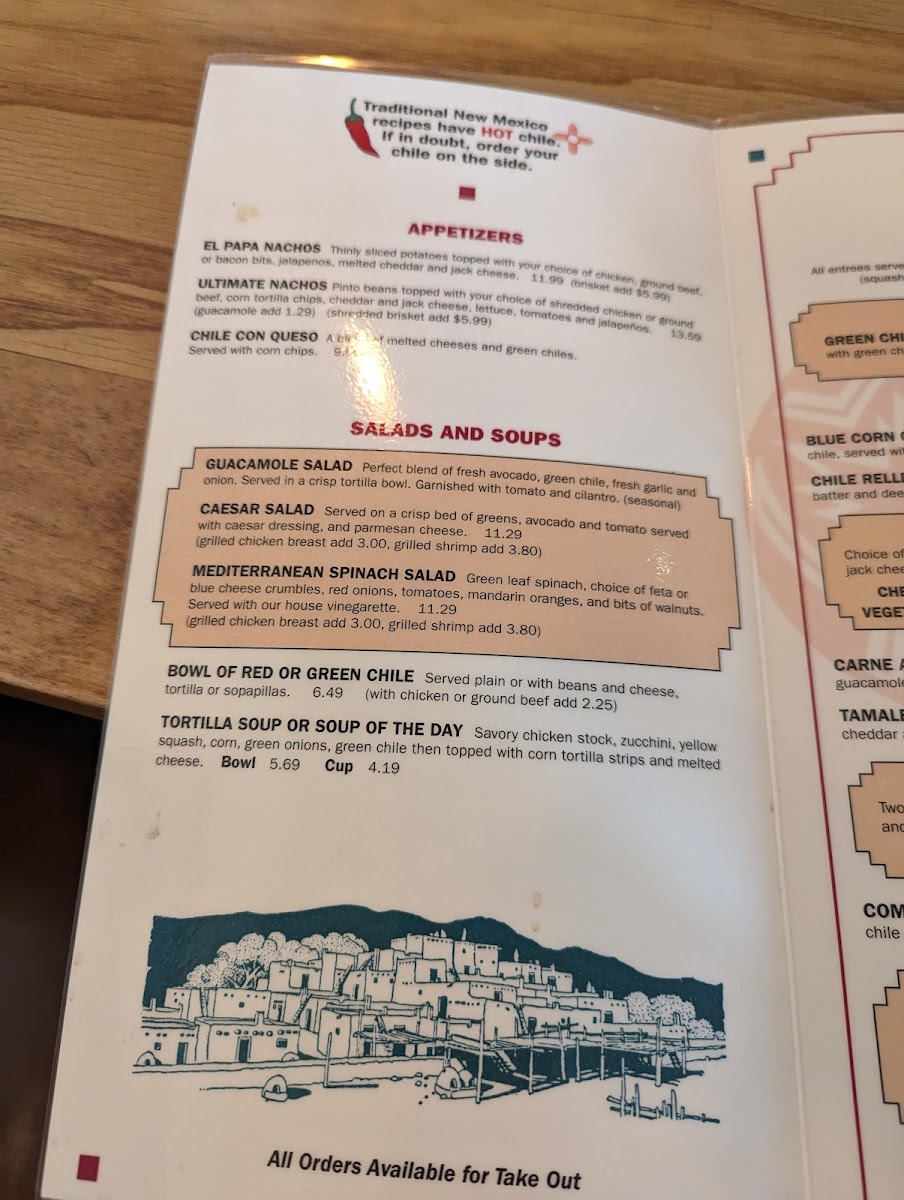 Cheese enchilada, tamale, chicken taco, posole, pinto or black beans, red or green chile, tortilla or sopapilla.