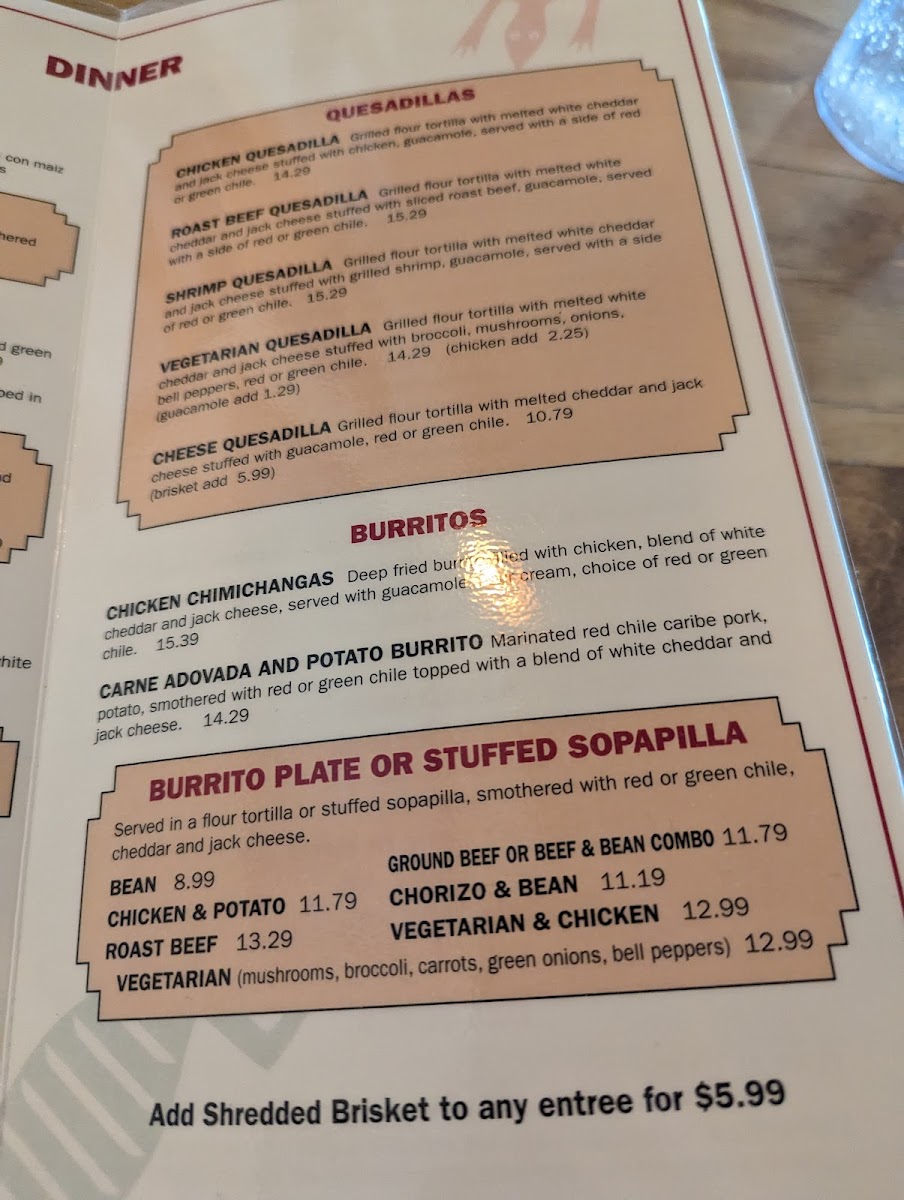 Red or green chile, pinto beans, ground beef, cheese, & tomato. Onions on request. Make it vegetarian, add calabacitas.